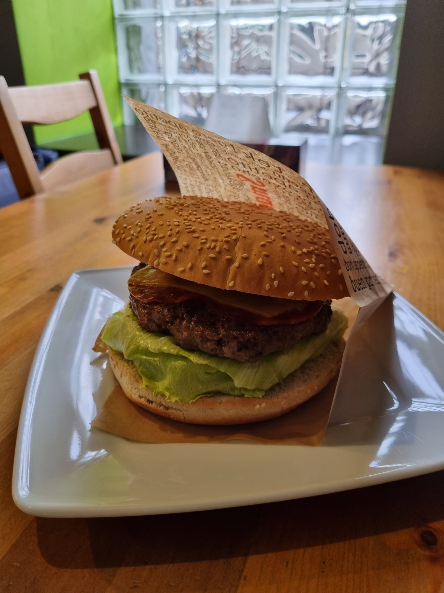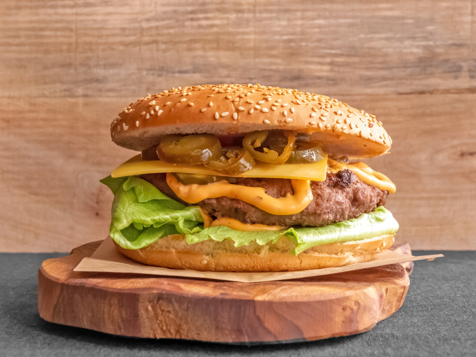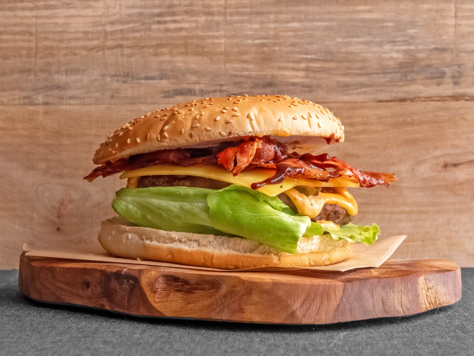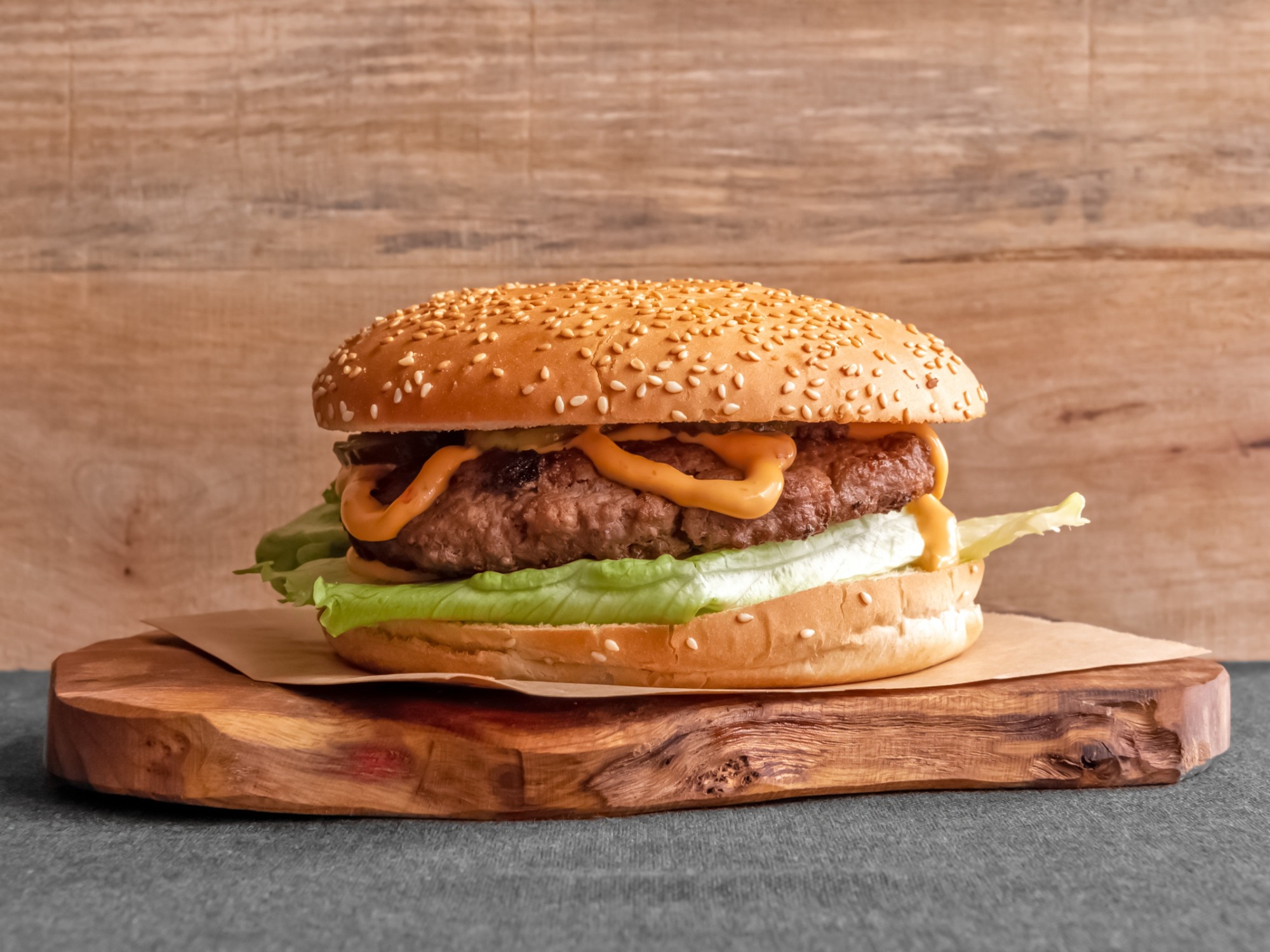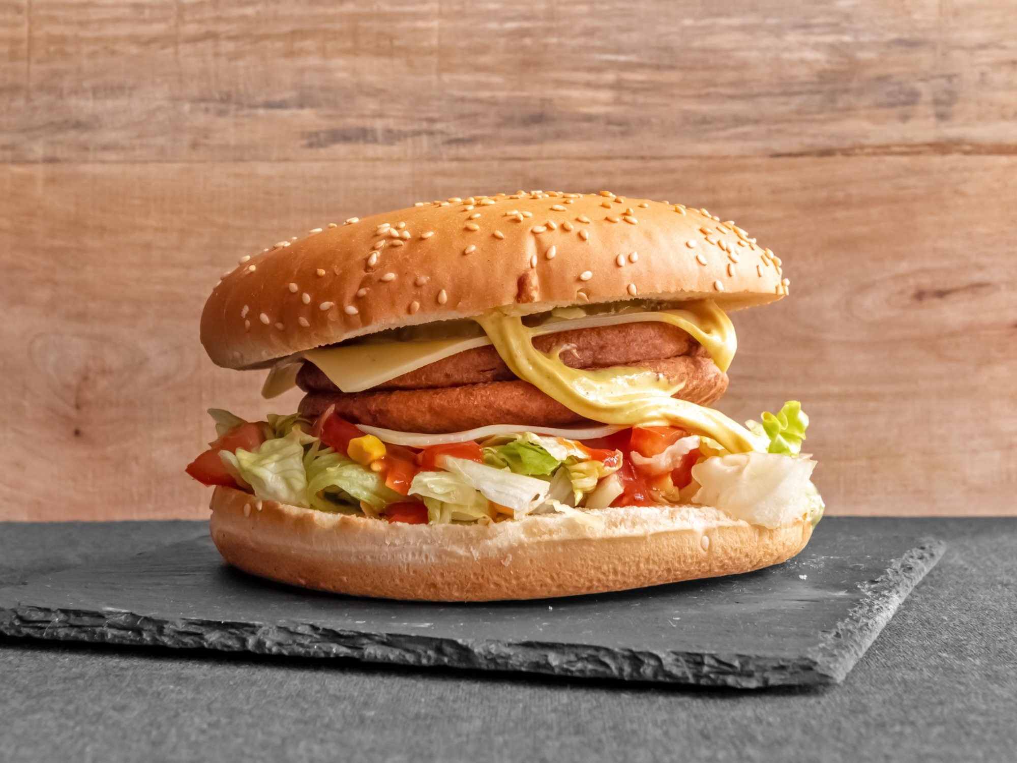 bułka zapiekana w piecu, podwójny kotlet, ketchup, sos, sałata lodowa z pomidorem i ogórkiem, pikle. -