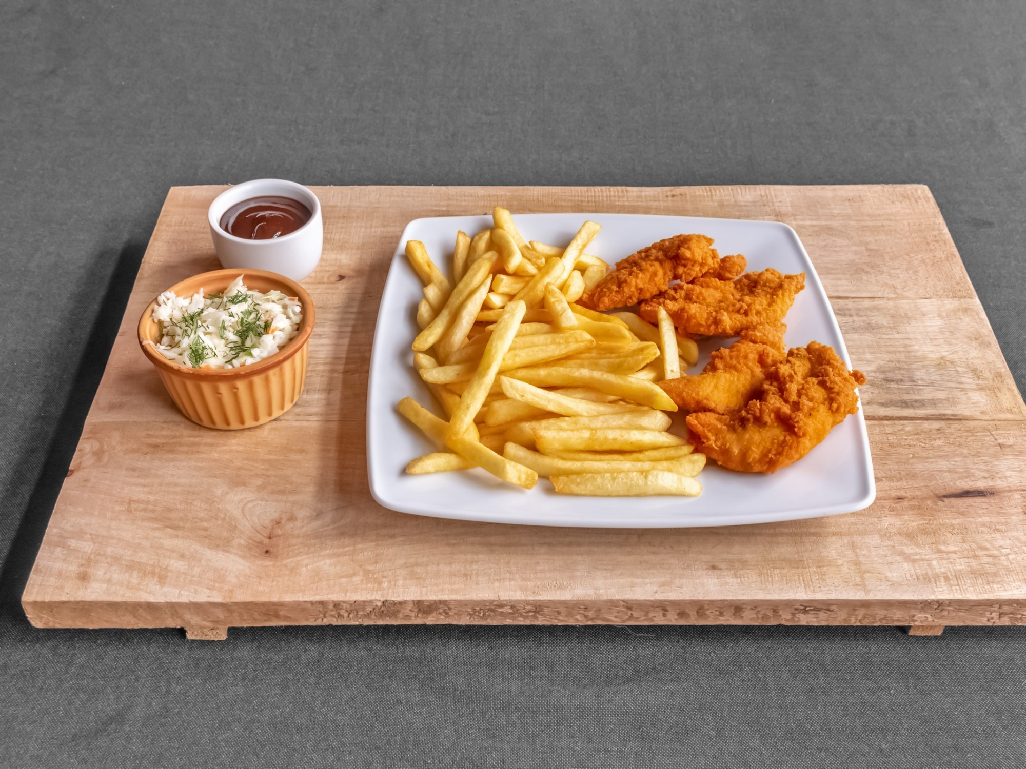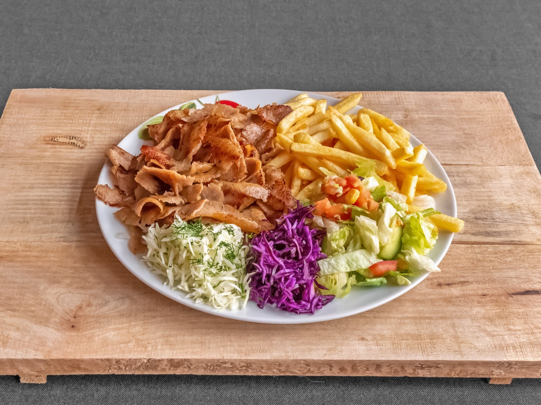 mięso kebab 200gr , frytki 200gr, surówki, sos do wyboru. -