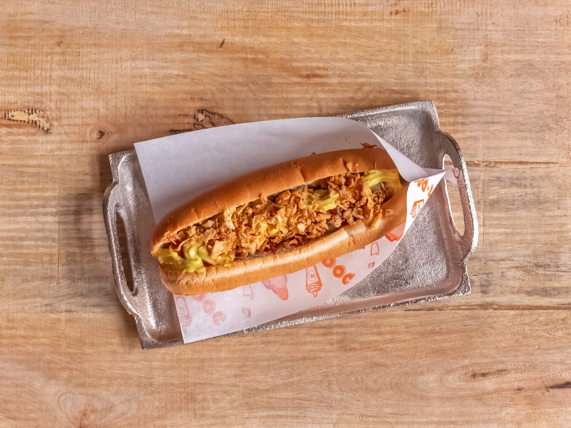 parówki zawijane w tortilli 30cm z cebulą, sosem oraz sałatą lodową z pomidorem i ogórkiem.