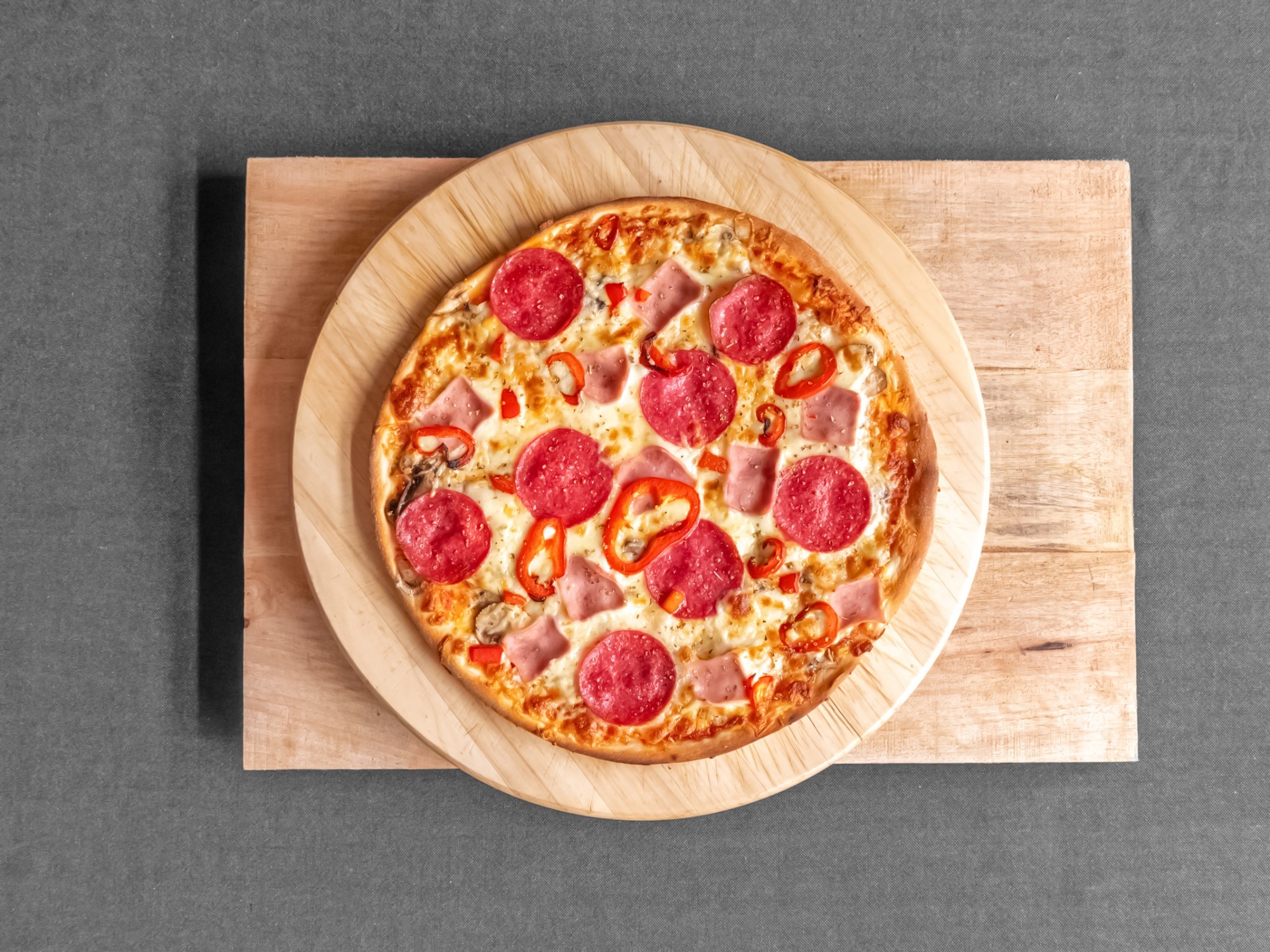 Grube ciasto, sos pomidorowy, pieczarki, cebula, szynka, papryka, ser, zioła -