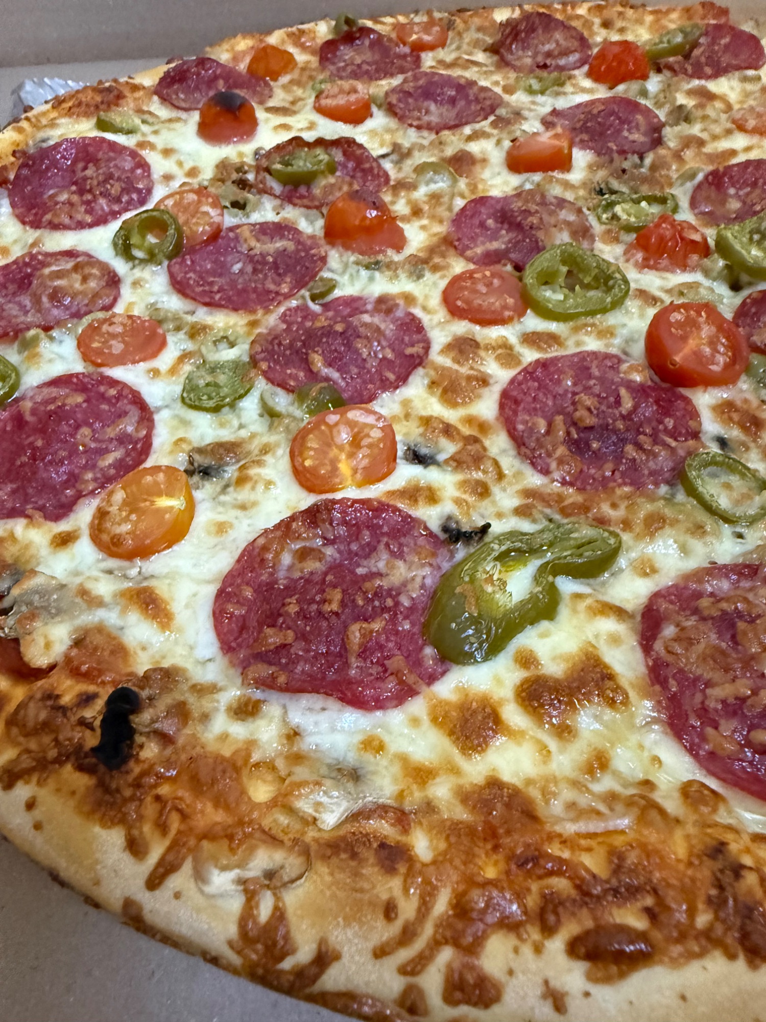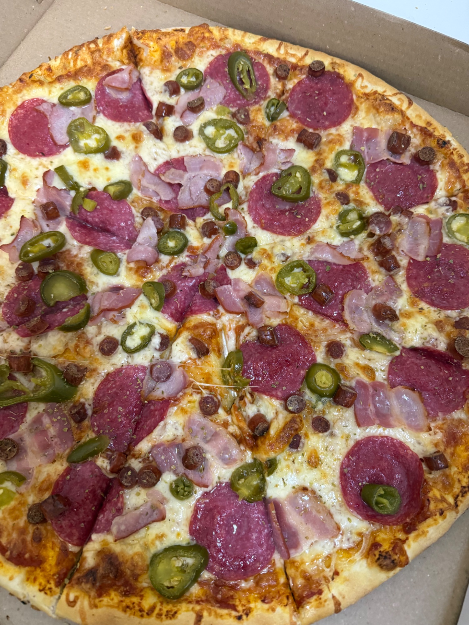 cebula, salami, ananas, oliwki, papryka jalapeno, ser, zioła -