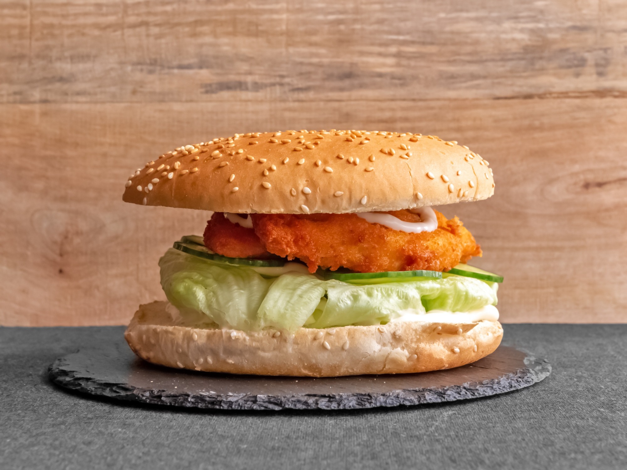 bułka zapiekana w piecu, kotlet, ketchup ,sos, sałata lodowa z pomidorem i ogórkiem, pikle. -