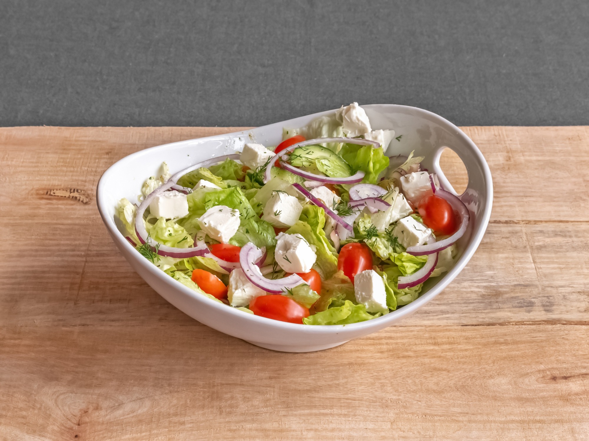 kapusta biała z koperkiem, kapusta czerwona, sałata lodowa z pomidorem i ogórkiem.