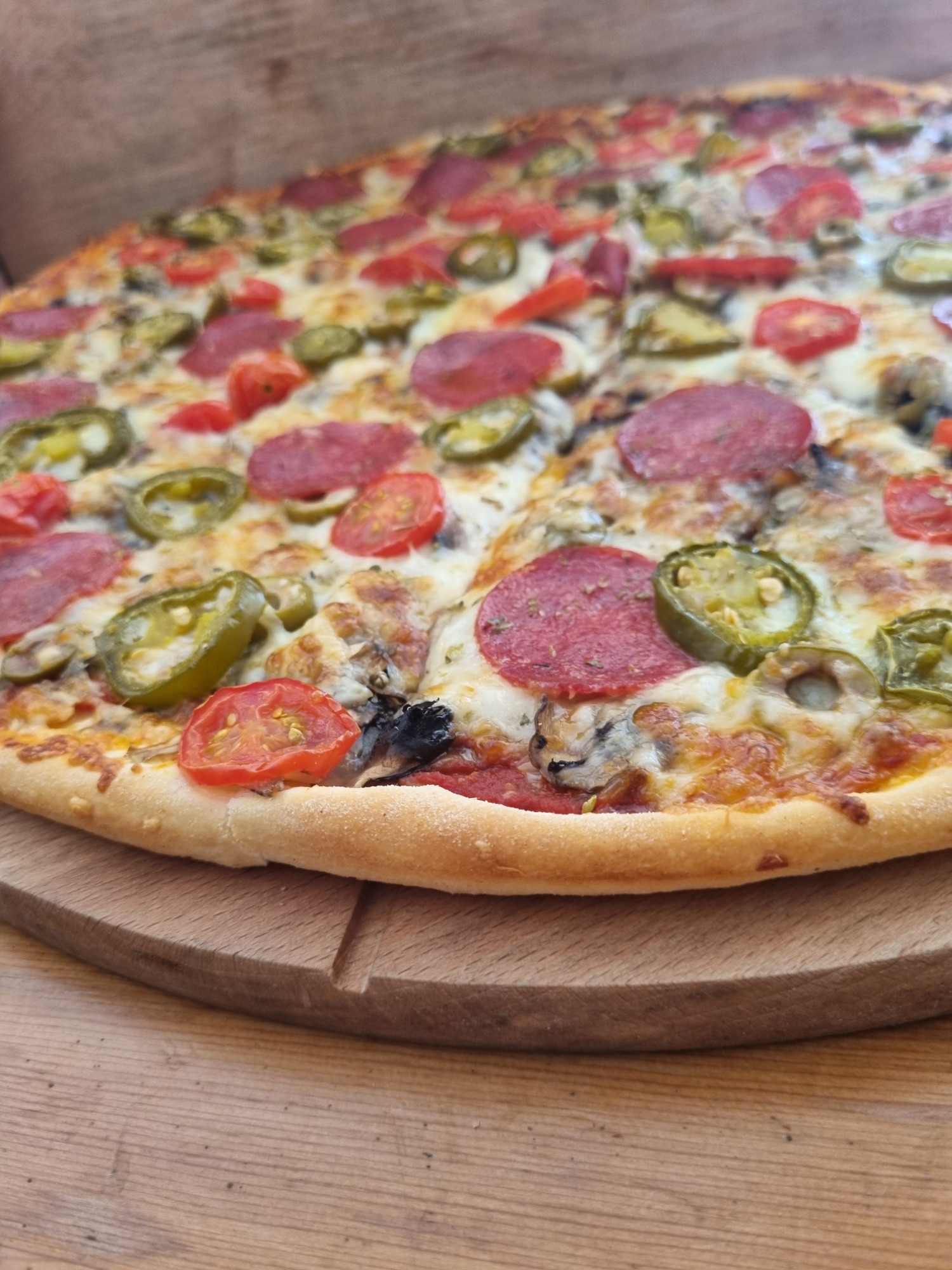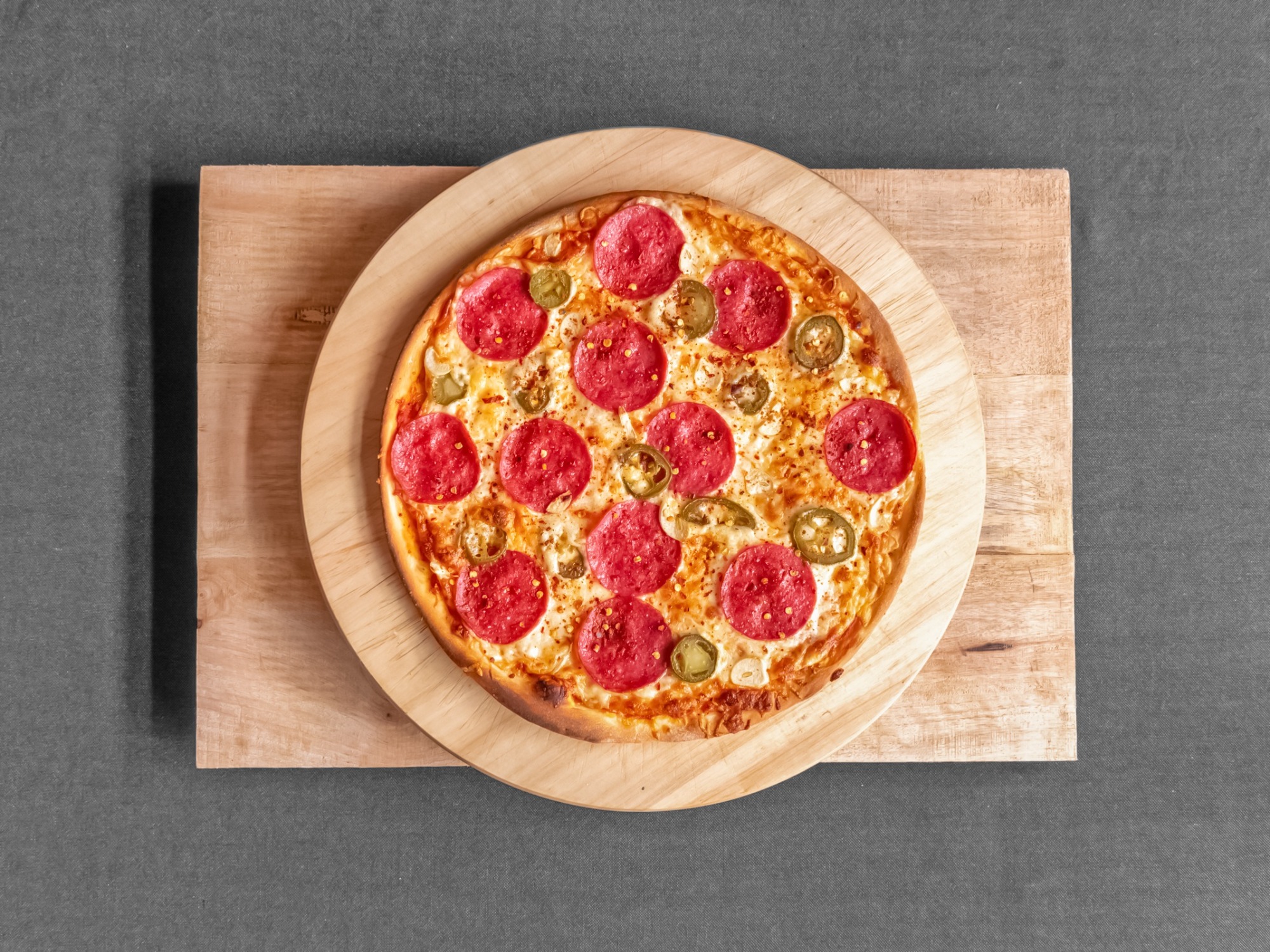cebula, salami, boczek, kabanos, papryka jalapeno, ser, zioła -