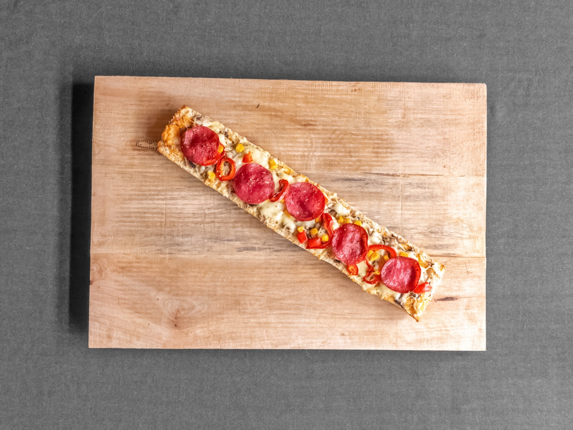 pizza na spodzie czosnkowym cebula, salami, brokuły, ser, zioła -