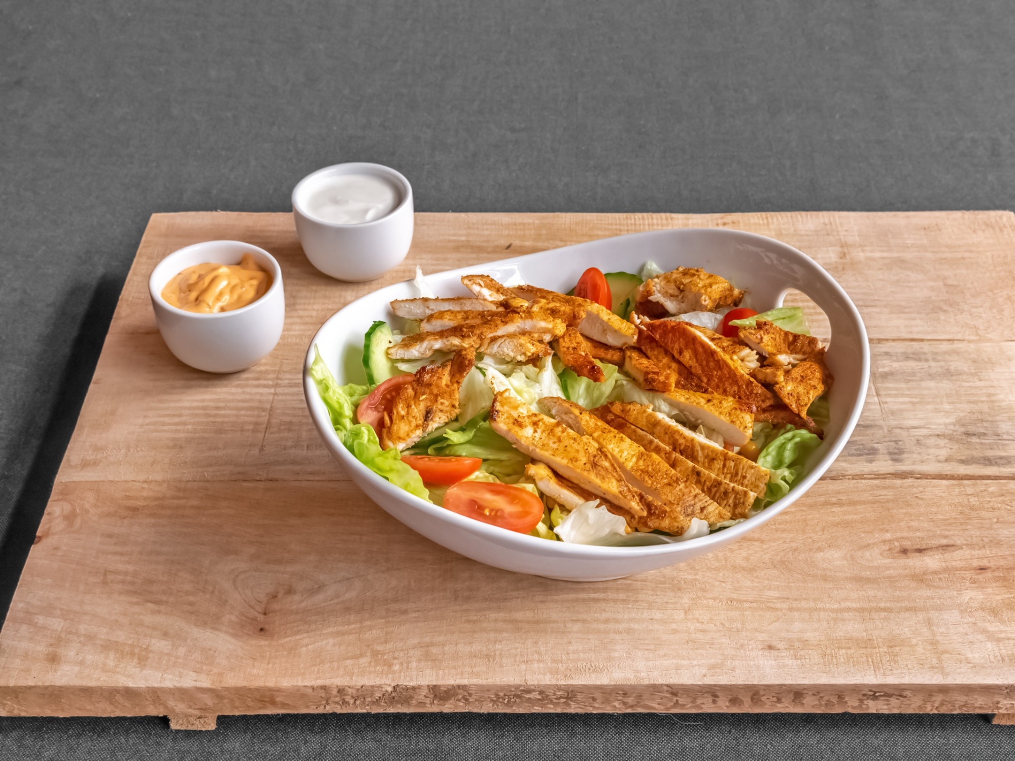 Grillowany filet z kurczaka, sałata lodowa, pomidor koktajlowy, ogórek, kukurydza, grzanki ziołowe, sos do wyboru